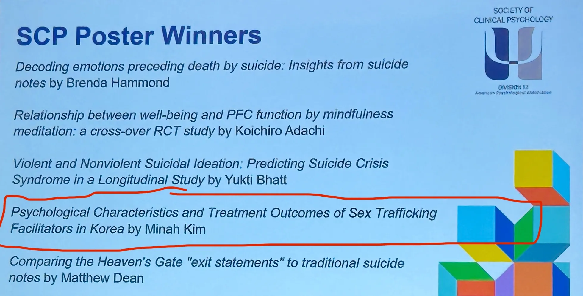 “축” 미국심리학회 포스터 발표 임상심리협회(SCP) 우수상 수상